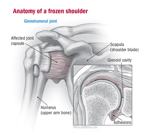 Treatment for frozen shoulder involves range-of-motion exercises and, sometimes, corticosteroids and numbing medications injected into the joint capsule. In a small percentage of cases, arthroscopic surgery may be indicated to loosen the joint capsule so that it can move more freely.